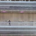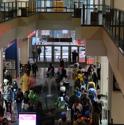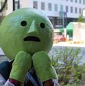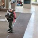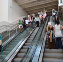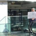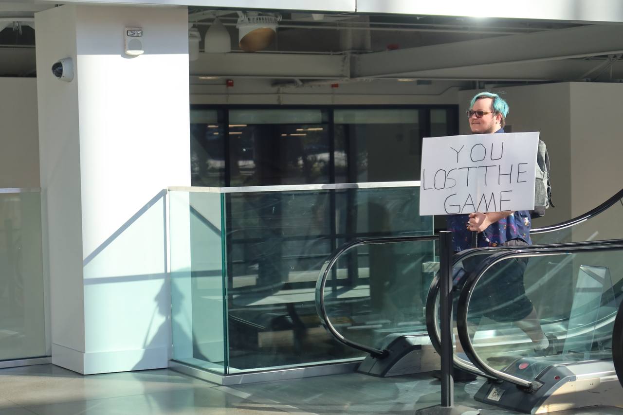 The fella with the sign, as far as I'm aware, just rides the escalators and walks around the conference to mess with people. I saw him last year as well.