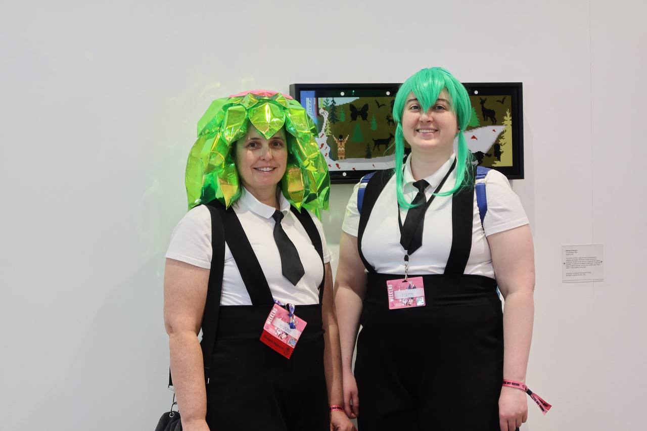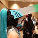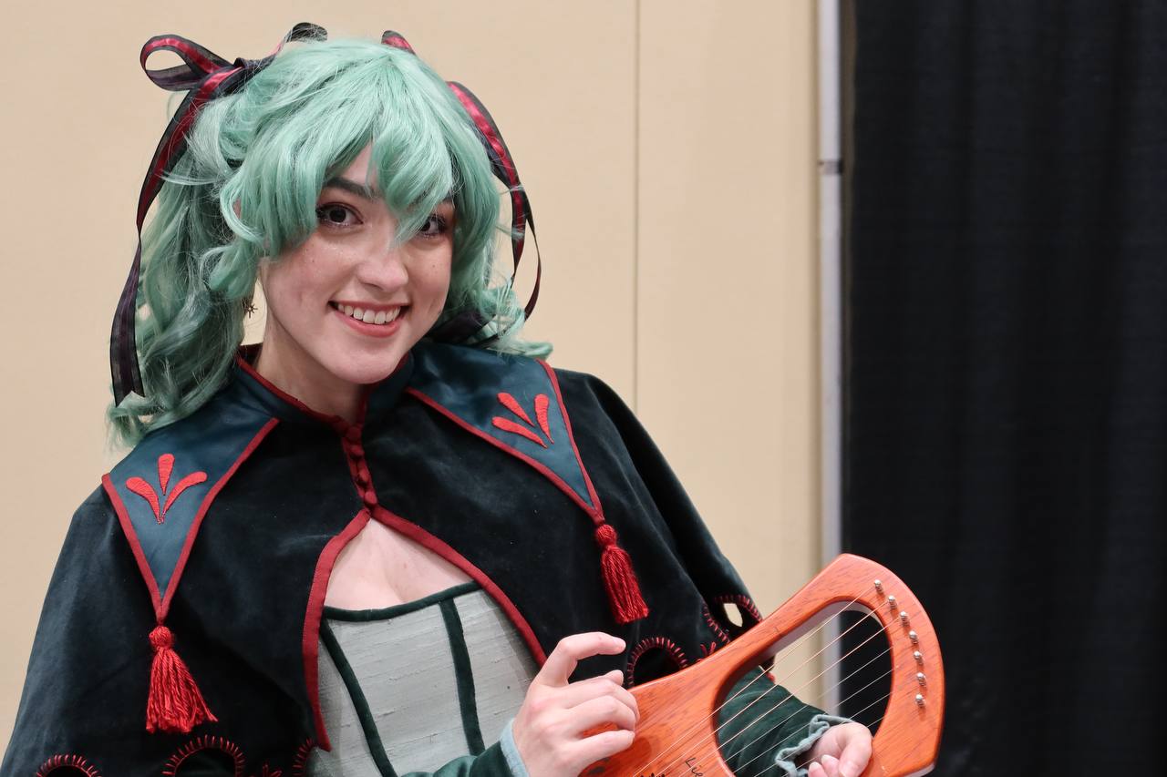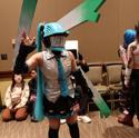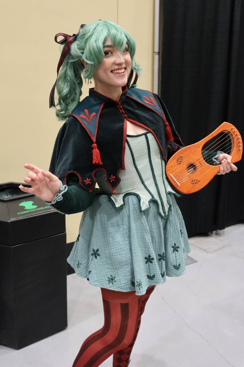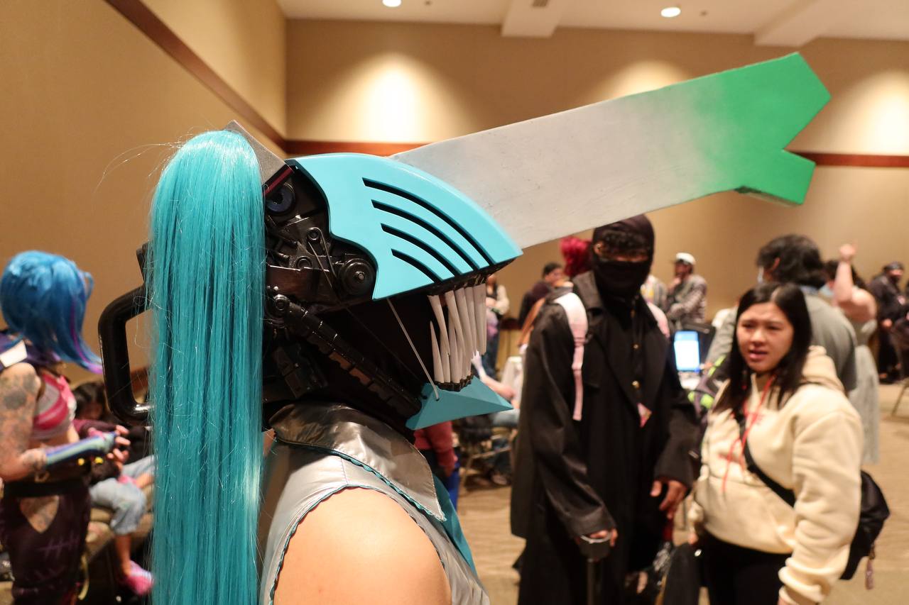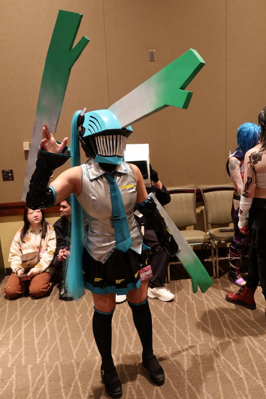 Among the well-known faces, there is one who reigns supreme at an anime convention. Hatsune Miku, the anime girl that even your grandparents can recognize, the #1 mover of anime merchandise in the world, the blue-haired vocaloid, was everywhere that you looked. Being the most popular, there were plenty of bad Miku cosplays. There were plenty of unimaginative Miku cosplays. What I really loved were the unique Mikus that I saw. Here I have photos of my two favorite Mikus from the event. First is a Chainsaw Man / Miku hybrid with leeks for weapons. And second that we have is a rare Bard Miku. I spoke with her a bit and she said that lots of people don't recognize her as a Miku at first, but I spotted it instantly. She asked me to hold my hands out in a cup (as if to hold water), then told me that there was a leak in it while giving me a hand-drawn leek sticker. These Mikus took the cake.