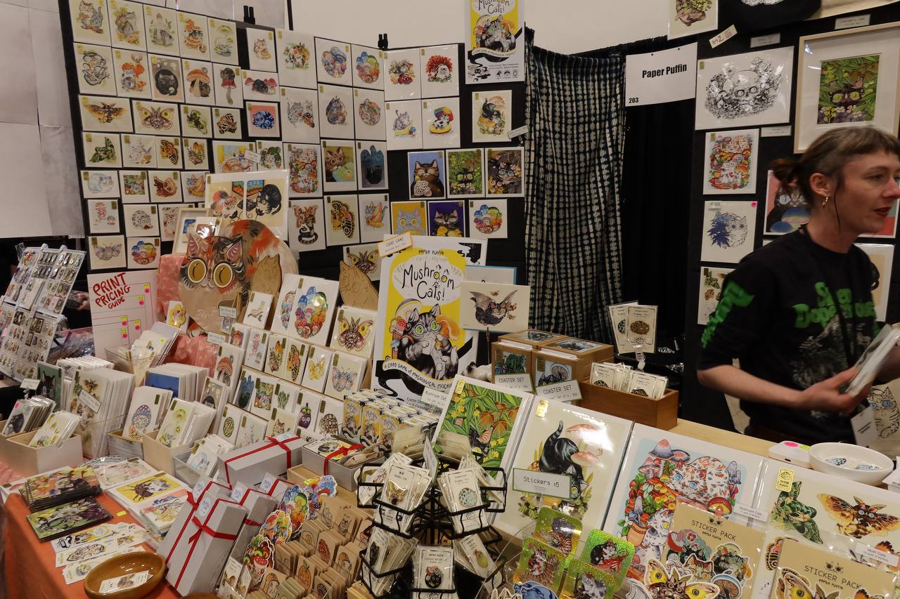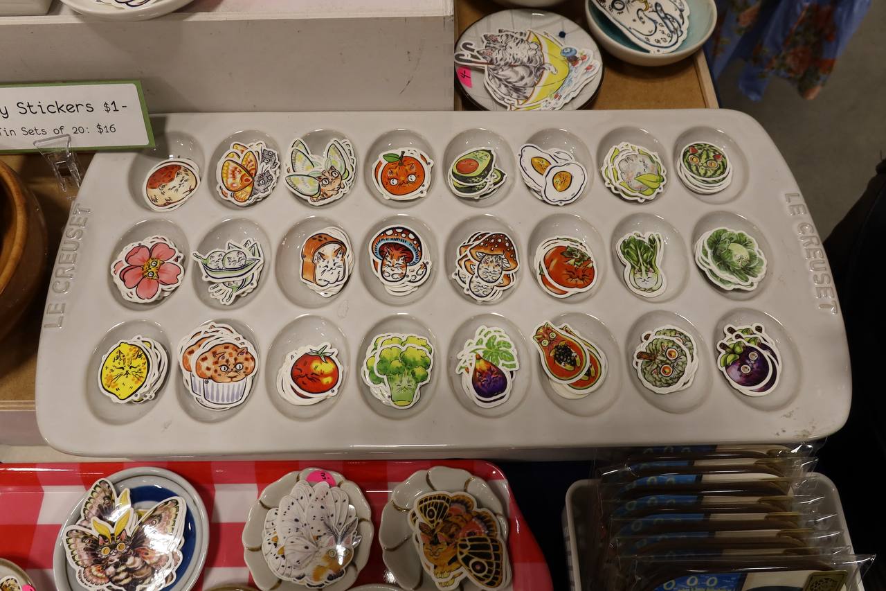 Art, both man-made and AI generated, was available for purchase in as many forms as you can image. There were post cards, stickers, posters, tapestries, patches, enamel pins, and so on to infinity. All sporting designs both original and copied from any popular culture franchise. There was obviously a strong Japan-leaning tendency among what you could find, though it wasn't exclusive. Some francises were decidedly American, and some stuff only had a passing "oh I guess cuteness as a concept is Japanese".