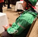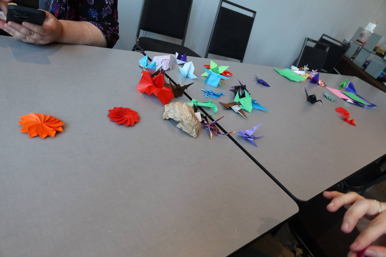 In a similar hands-on vein to the furoshiki panel, we found ourselves at an origami panel. Here we learned a bit about the history of origami, the etymology of the term, and got some hands-on practice folding paper. In the panel, they taught the whole class how to fold this dragon and alien, walking through step by step slowly. For the stragglers (like myself) who couldn't figure some parts out even after seeing it directly in front of me, the panel team even had people walking around the room to give hands-on help to the students. The whole event was really well-done.