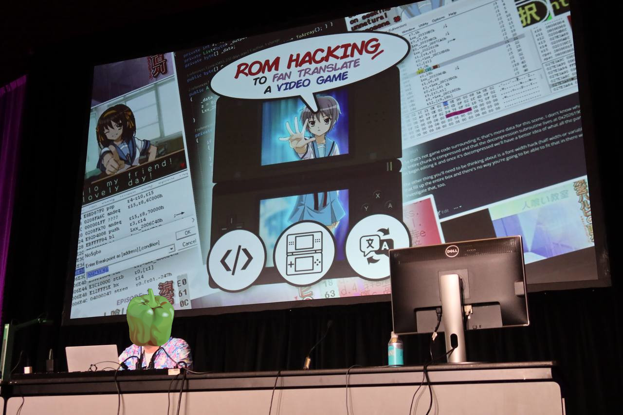 The final memorable talk that we attended was one about ROM hacking to translate a Japanese videogame. I'm used to seeing technical talks at technical conferences, but this was not something that I had at all expected to see at Sakura Con. Fundamentally, this talk was about passion driving a community to reverse engineer an entire Nintendo DS videogame in order to make it accessible to English-speakers.