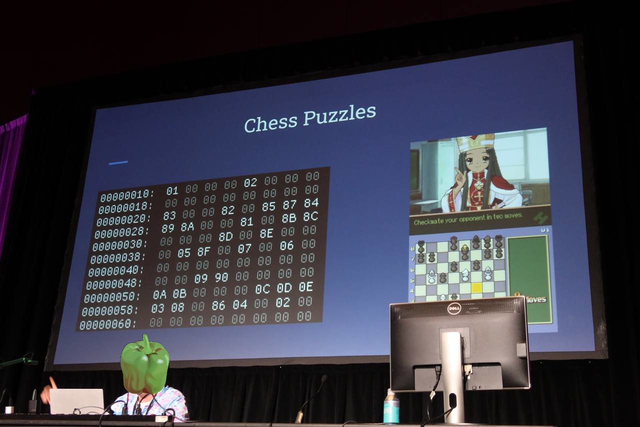 The technical breadth of this talk was stupendous, an absolute tour de force on the speaker's part. It was interactive with the audience as well, with the crowd collectively choosing which topics to cover. The different aspects of the game were reverse-engineered independently of each other, and some of the most memorable aspects were: